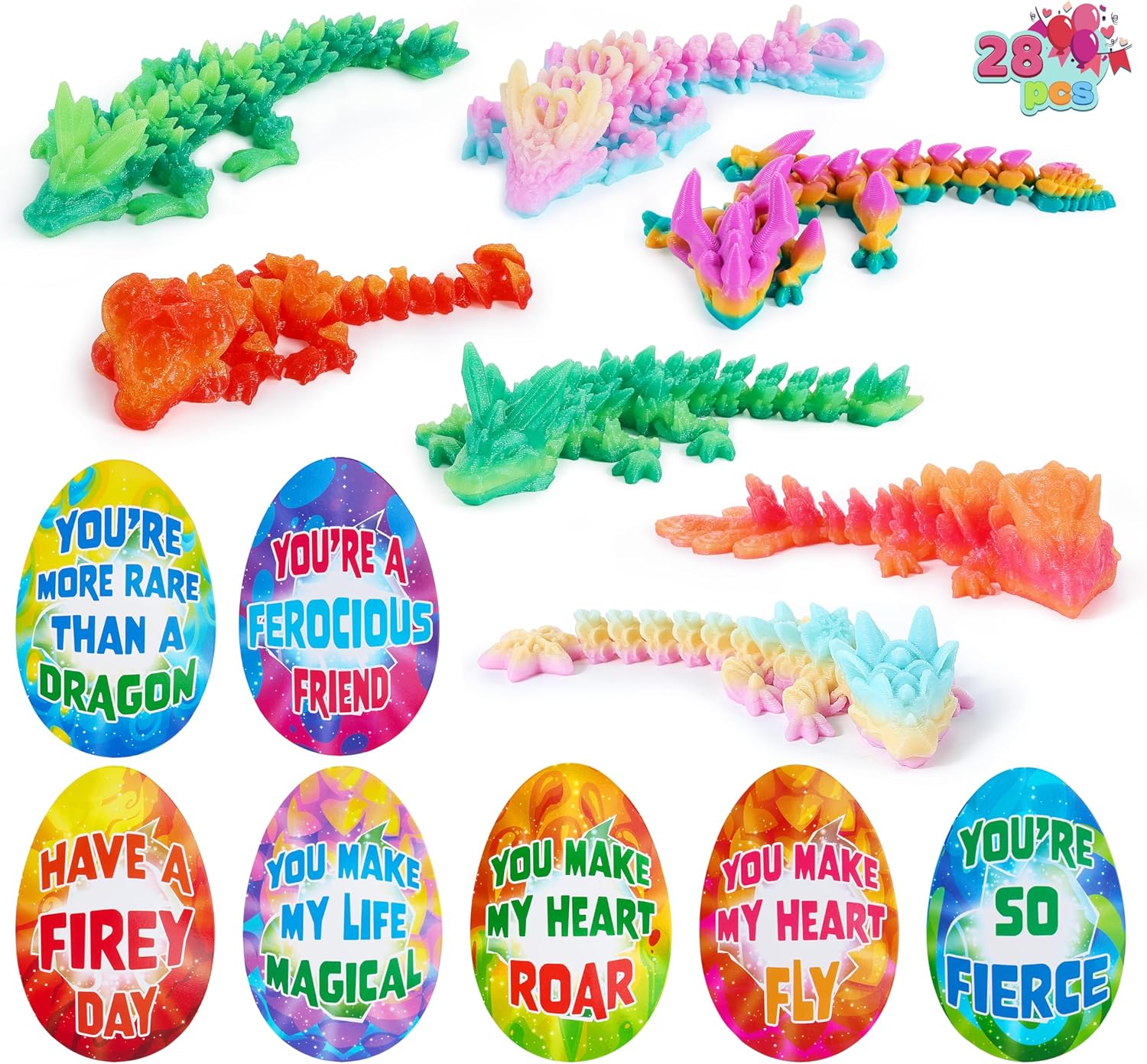 - Super Value Pack:Get a charming set of 28 beautifully crafted 3D-printed dragons! With 7 Individual dragon types and a themed Valentine’s card for each, this collection is ready to spread enchantment and friendship everywhere.